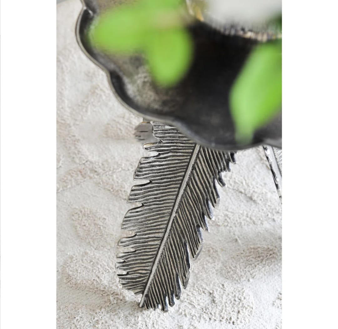 unleash beauty of leaf side table, a piece that showcases harmony of nature and design. leaf accents on legs create a serene and natural atmosphere. crafted from superior aluminum and finished with a charming silver antique finish, this table is a testament to fine craftsmanship. round top provides a practical surface for your daily use. measuring and a compact and efficient addition to your living room. assembly is a simple matter, ensuring that you can enjoy elegance of this side table without hassle. elevate your home decor with leaf side table. : leaf side table, serene atmosphere, superior aluminum, charming finish, practical surface, compact addition, simple assembly discover elegance of leaf side table, a piece that combines natural elements with modern style. leaf motifs on legs give it a distinctive and graceful look. crafted from high-grade aluminum and finished with an exquisite silver antique finish, this table is a work of art. round top provides a functional area for your necessities. measuring it is a well-proportioned and space-optimizing choice for your living room. enabling you to effortlessly enhance beauty of your space with this side table. : leaf side table, distinctive motifs, high-grade aluminum, exquisite finish, functional area, well-proportioned choice, simple enhancement