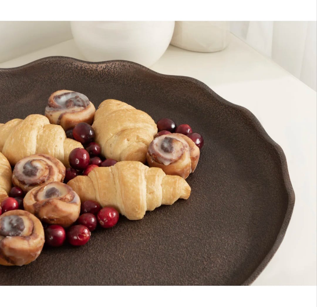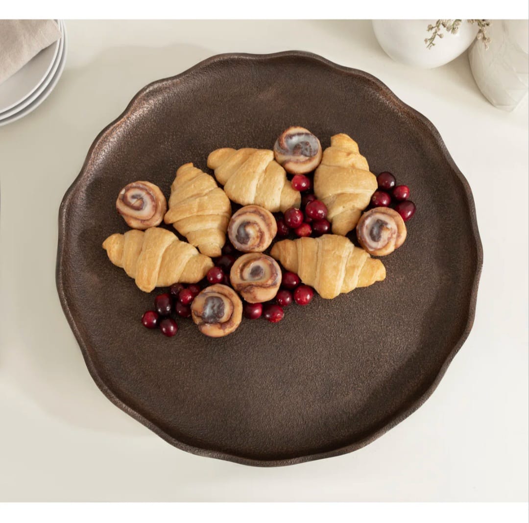his handcrafted aluminum tray brings a bold finish and rich texture to any room. Made using a sandcasting process, it showcases a rugged texture and a curvy, deckled edge for lots of distinct character. The scalloped design makes it an eye-catching piece for your coffee table or a cocktail ottoman. This versatile piece can be used to serve drinks on coasters to guests or simply add a touch of decorative refinement to your home. Bonus: This tray is food-safe.