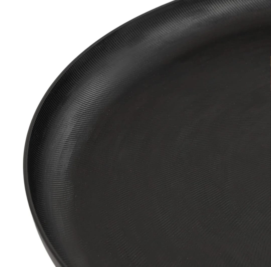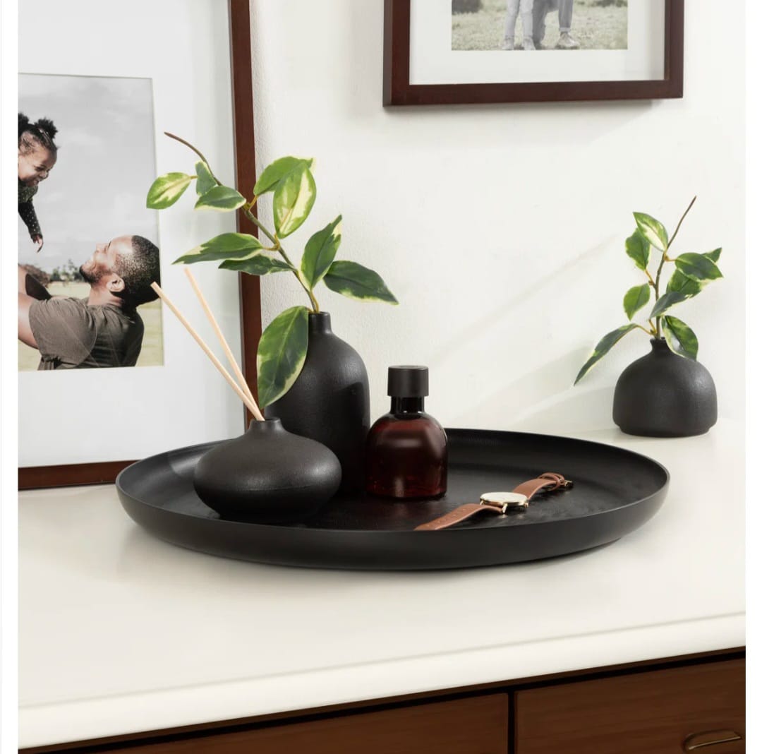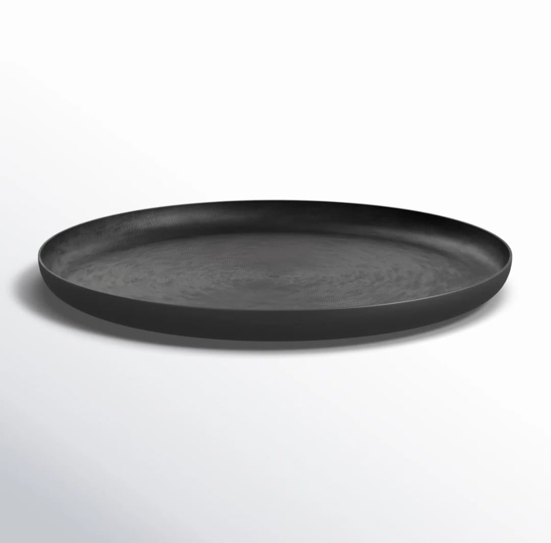 This decorative tray offers a stylish way to showcase your favorite decor pieces or serve up snacks with flair. Crafted from aluminum, its round shape and textured design add a touch of elegance to your living room or entryway. While it's not food safe, it makes a stunning centerpiece on your coffee table or console. The felt pads underneath ensure your surfaces remain scratch-free, allowing you to rearrange with ease. Whether you're hosting or simply sprucing up your space, this tray is a versatile addition that complements any decor.