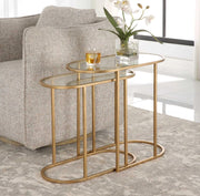 This 2-piece nesting table set brings a luminous, space-saving accent to your living room or bedroom. Crafted with slim iron frames in a solid finish, each table features an ovular clear tempered glass top that adds an airy, modern feel. The smaller table tucks neatly beneath the larger one, offering flexible styling and easy storage when not in use. We love that the open-frame design keeps the look light and elegant, perfect for layering next to a sofa or accent chair.
