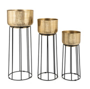 Enhance your indoor greenery with this gorgeous set of 3-floor planters. Featuring a sturdy black metal frame and gleaming gold planter bowls, these planters are sure to add a touch of luxury to your home. The textured surface of the bowls provides a beautiful visual interest, while the three different sizes (small: 8" x 8" x 20.5", medium: 9" x 9" x 26", large: 11" x 11" x 30") allow you to design the perfect arrangement for your space. Made of durable metal, these planters are built to last and provide a stunning display for your plants for years to come